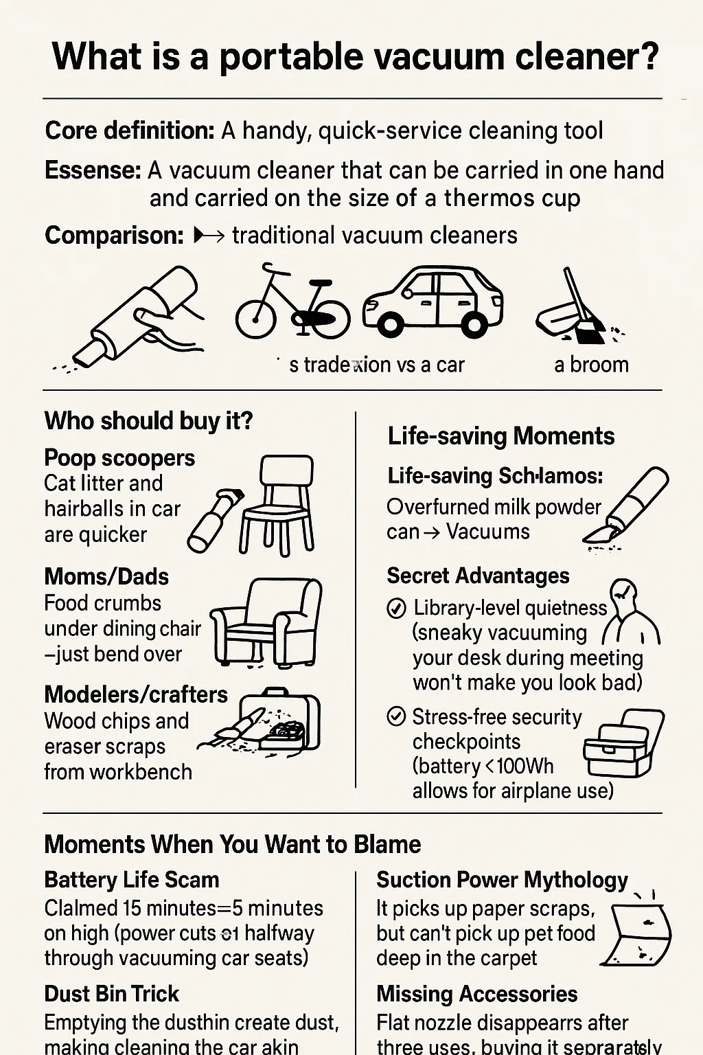 Сравнение: ► с традиционными пылесосами: как складной велосипед и автомобиль, жертвуя производительностью ради максимальной портативности. ► против метлы: это лучший вариант для бисквитных крошек в швах дивана; бесполезно для очистки больших площадей пола.