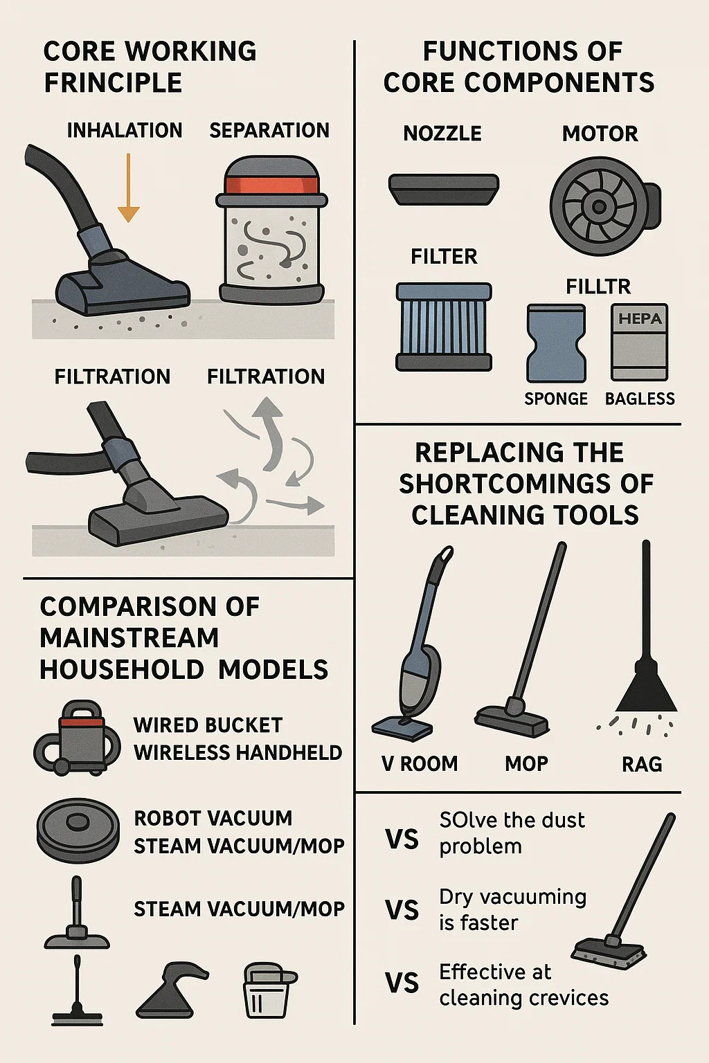 Ключевые операции: ▶ Вдыхание - двигатель вращается, создавая область низкого давления. Воздух, несущий пыль, бросается в всасывающее сопло; ▶ Разделение - смесь пыли прокручивается в мусорном ведре, в результате чего тяжелые частицы попадают в коробку для сбора пыли; ▶ Фильтрация - тонкая пыль ловит фильтром, а чистый воздух выброшен с задней части.